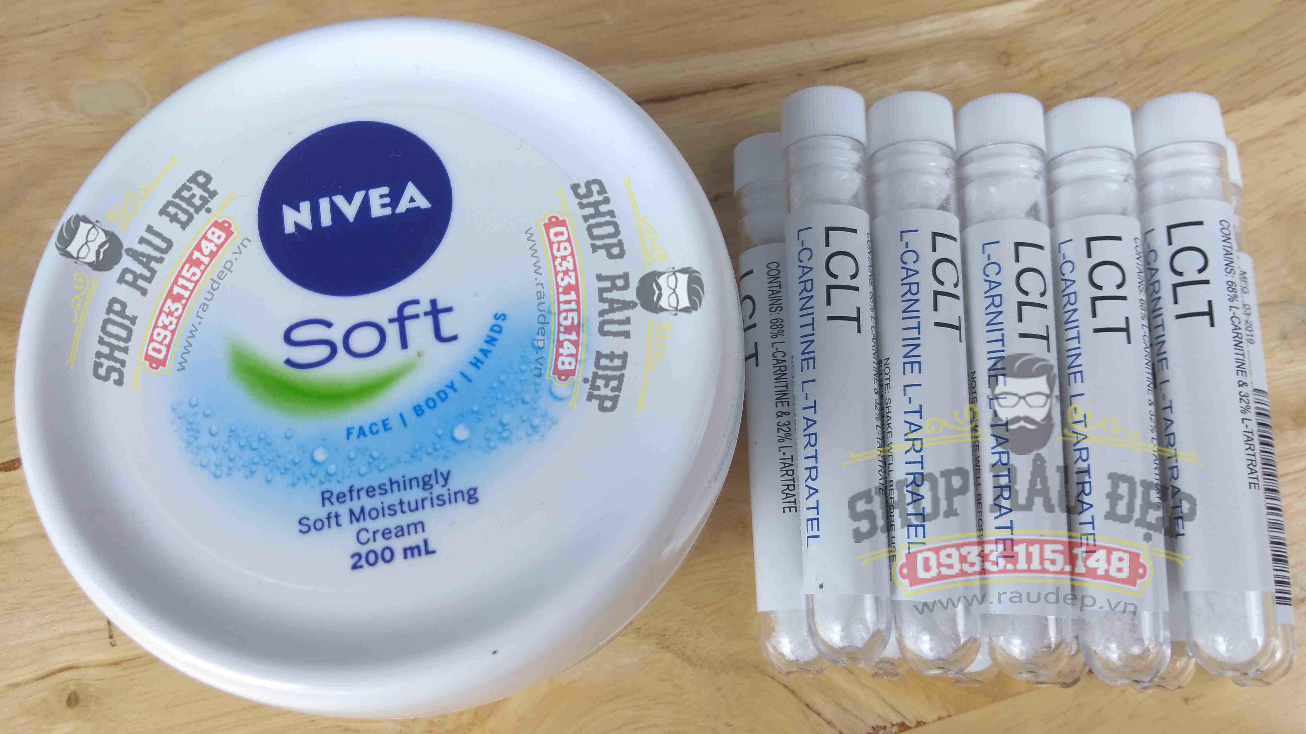 Bột LCLT pha với Nivea Soft kem dưỡng ẩm da và tốt cho râu. Nếu bạn đang dùng Minoxidil lỏng mọc râu mà da bị khô và dị ứng, bạn có thể sử dụng thêm Nivea Soft làm mềm da và kết hợp tận dụng thêm pha trộn LCLT vào kem dưỡng ẩm nhầm tăng khả năng kích thích mọc râu. Tỷ lệ pha là bột LCLT chiếm 2% thể tích chất trộn lẫn.