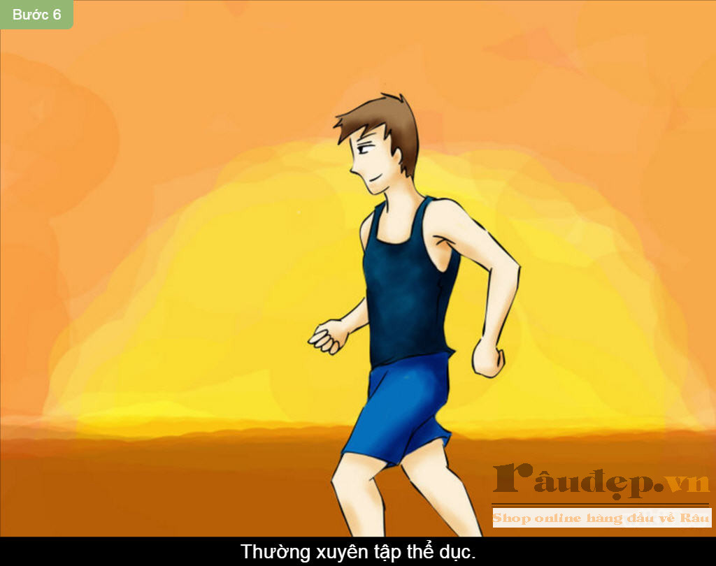 6. Thường xuyên tập thể dục. Tương tự như giấc ngủ, tập thể dục thường xuyên cũng là yếu tố quan trọng trong việc duy trì chức năng của cơ thể, bao gồm cả sự tăng trưởng của râu. Bạn nên tập trung tập luyện aerobic vì nó giúp cải thiện tuần hoàn máu.